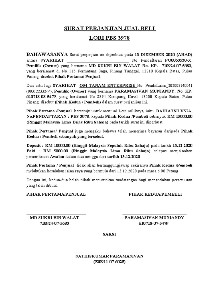 Contoh Surat Perjanjian Jual Beli Perniagaan Malaysia Otosection